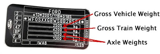 This metal plate is usually affixed to the inside of one of the door openings, or in the engine bay and displays 4 key figures; the "Gross Vehicle Weight" (maximum allowed weight of the vehicle, fully laden), "Gross Train Weight" (maximum allowed weight of the vehicle & a trailer, both fully laden) and "Axle Weights" (weights measured at each axle of the car).